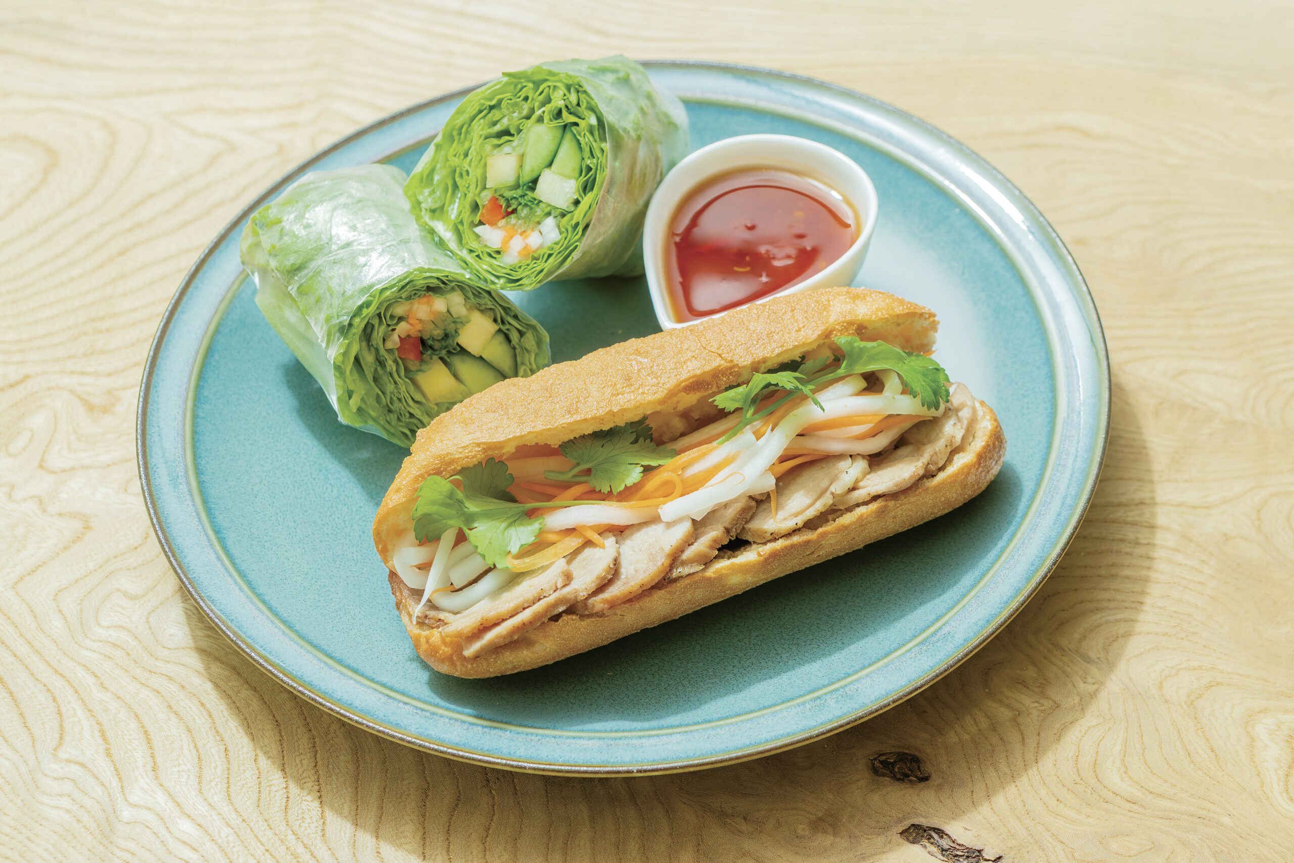 お店の顔にもなっているランチの人気メニュー「バインミーセット」。ベトナムのサンドイッチ、バインミーはフランスパンをベースにレバーパテやパクチー、なますなどのベトナムらしい具材を挟んだもので、「甘い・辛い・酸っぱい・旨い」を掛け合わせた複雑な味わいが特徴。女性でも食べやすいサイズ感が嬉しいですよね!