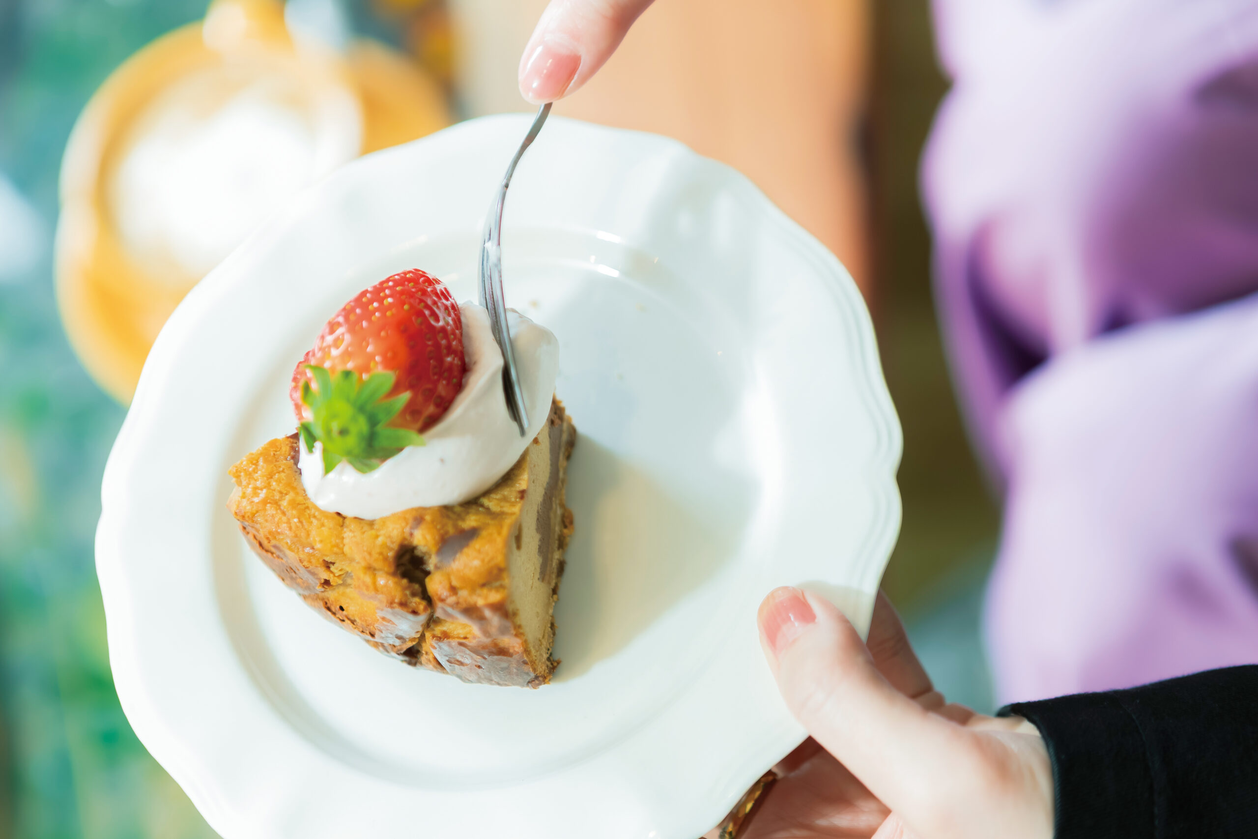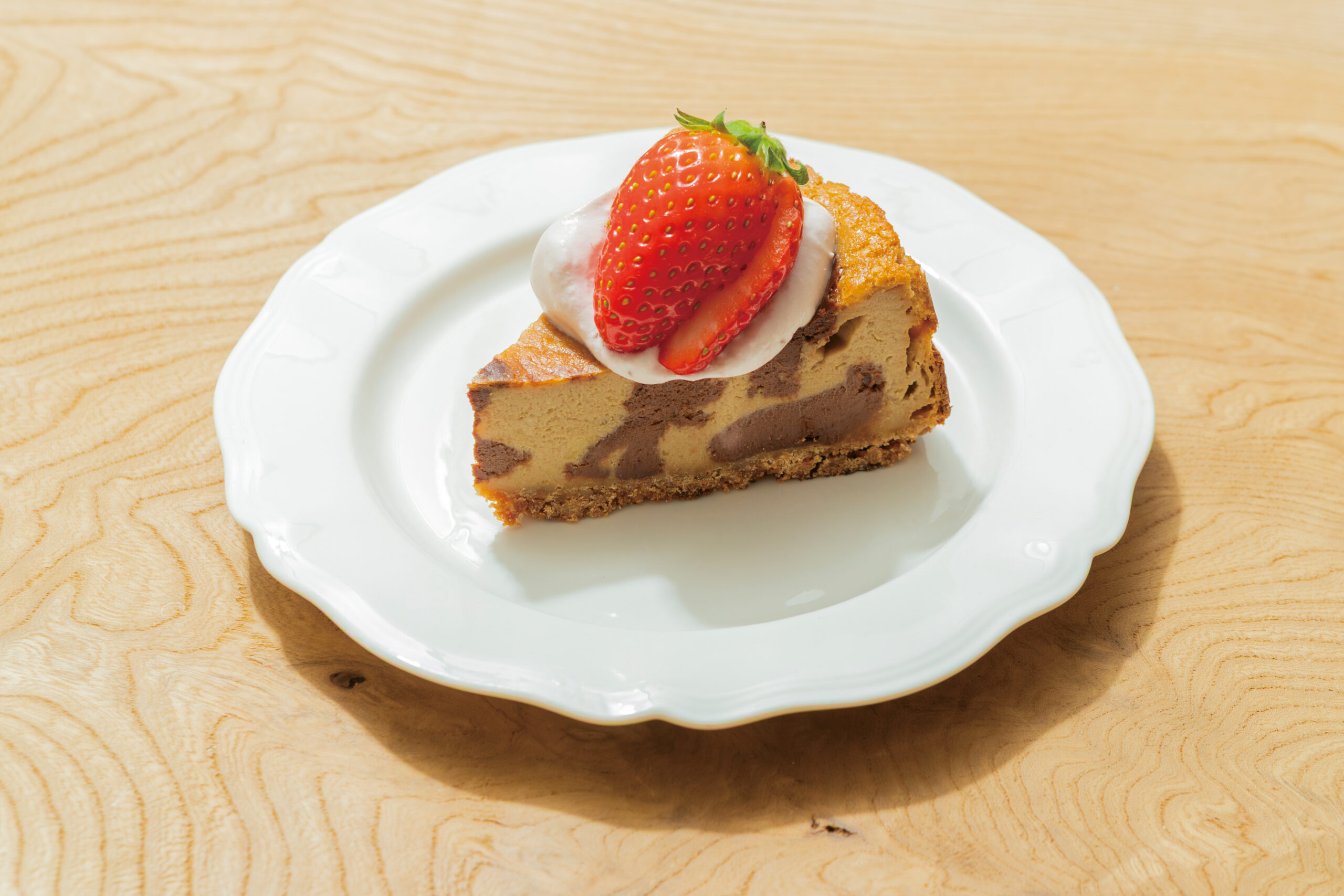 ほぼ月替わりで提供の、季節のチーズケーキ。写真はモカラテをイメージした、マーブル柄のモカチーズケーキです。⁡お店で淹れたエスプレッソを使用した、甘くてほんのり苦味を感じるケーキです。⁡自家製いちごソースが入ったいちごクリームとの相性もばっちりで、イチゴの酸味を感じて幸せな気分になります。