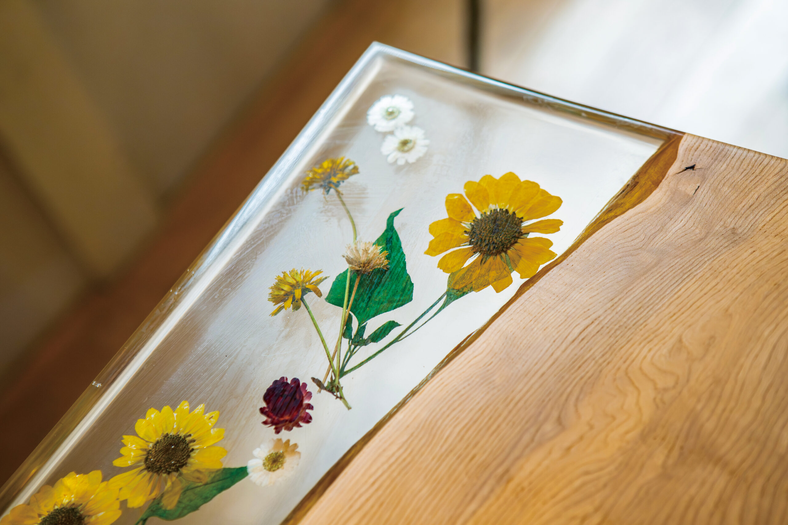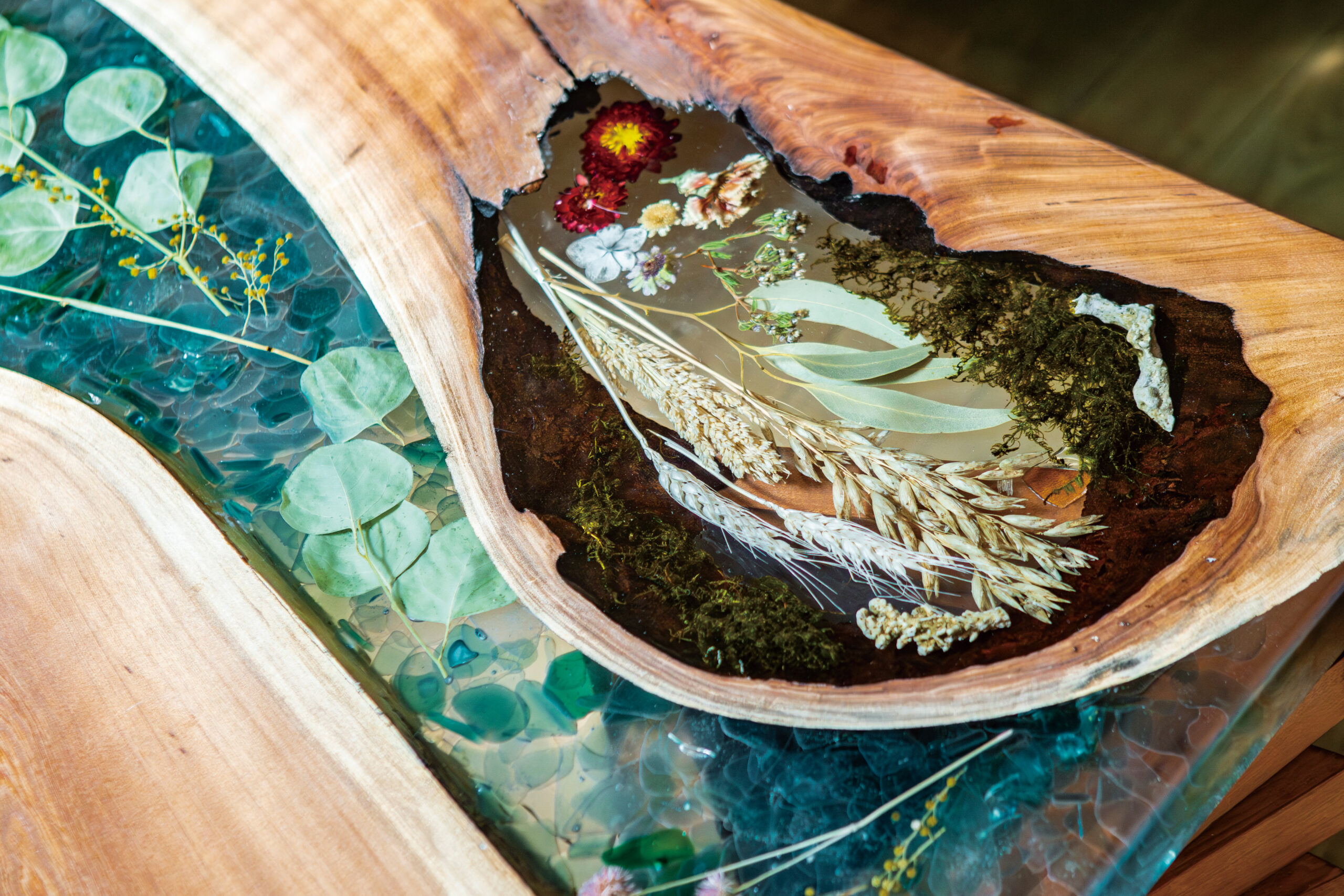 店内のテーブルには、色とりどりのドライフラワーを閉じ込めた樹脂と一枚板を組み合わせて作られた「レジンテーブル」と呼ばれるオーダーメイドの家具が使われています。