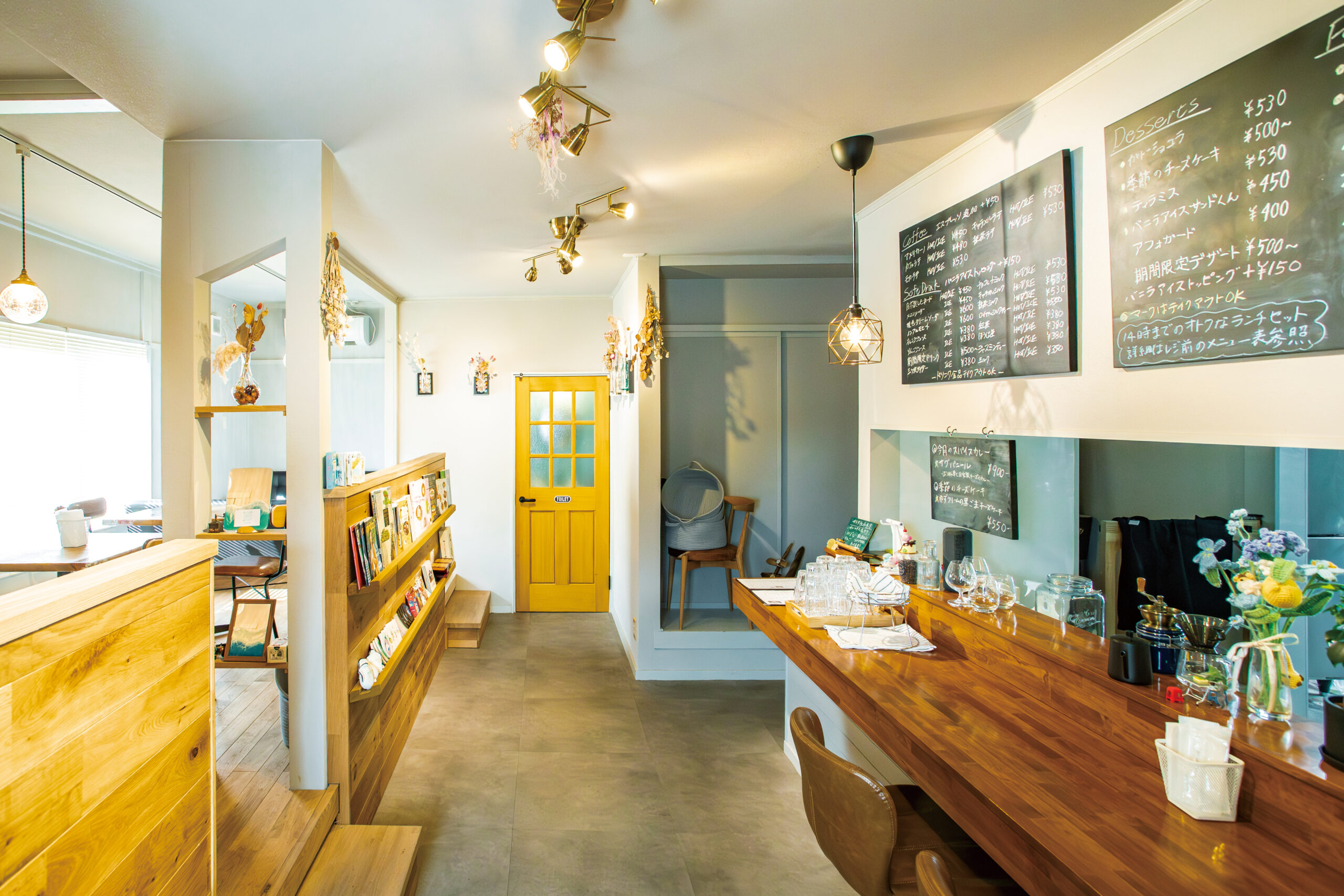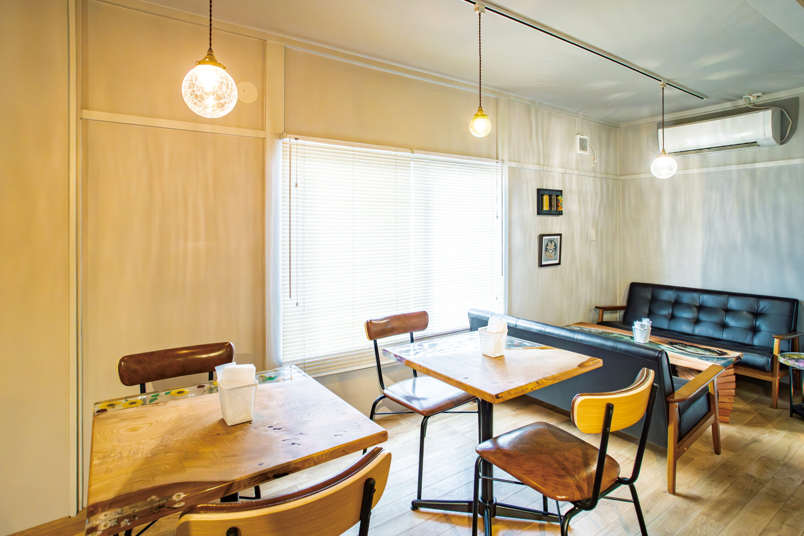 一歩店内に踏み入れると、ナチュラルな木の温もりが広がり、ペンダントライトの柔らかな灯りが優しい空間。カウンター席、テーブル席、奥にはソファ席もあるので、一人でふらりと訪れても、お友だち同士やデートなどで立ち寄っても、素敵な時間を過ごせることでしょう。