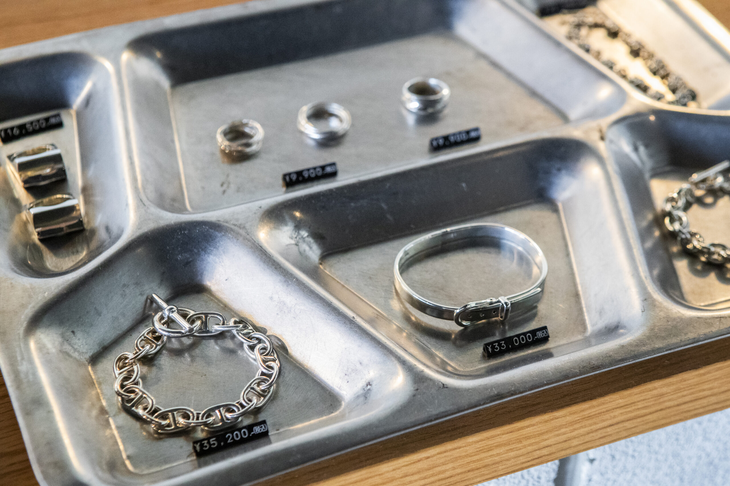 各ブランドのものからヴィンテージものまで、アクセントを加えてくれるジュエリー類なども。メキシコ・タスコにてハンドメイドで制作されたシルバーアクセサリーは、シルバーならではのしっかりとした重さと存在感はありながらも、燻し加工を敢えて省いて後加工を最小限にとどめることで、シンプルな表情に。