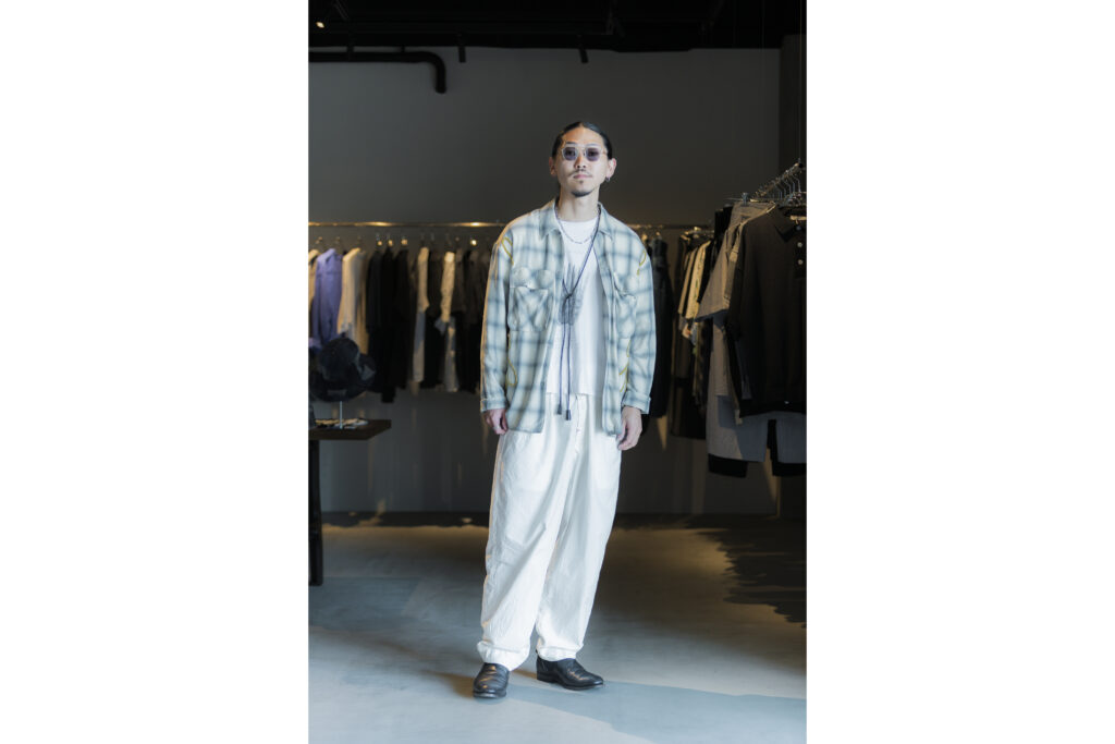 LEHのレーヨン100%のオンブレチェックシャツを主体に、同系色でコーディネート。ウエスタンぽい形のシャツは、フロントのフラップポケットと両脇の刺繍がポイント。シューズや小物をレザーでまとめあげ、上品さをプラスしています。