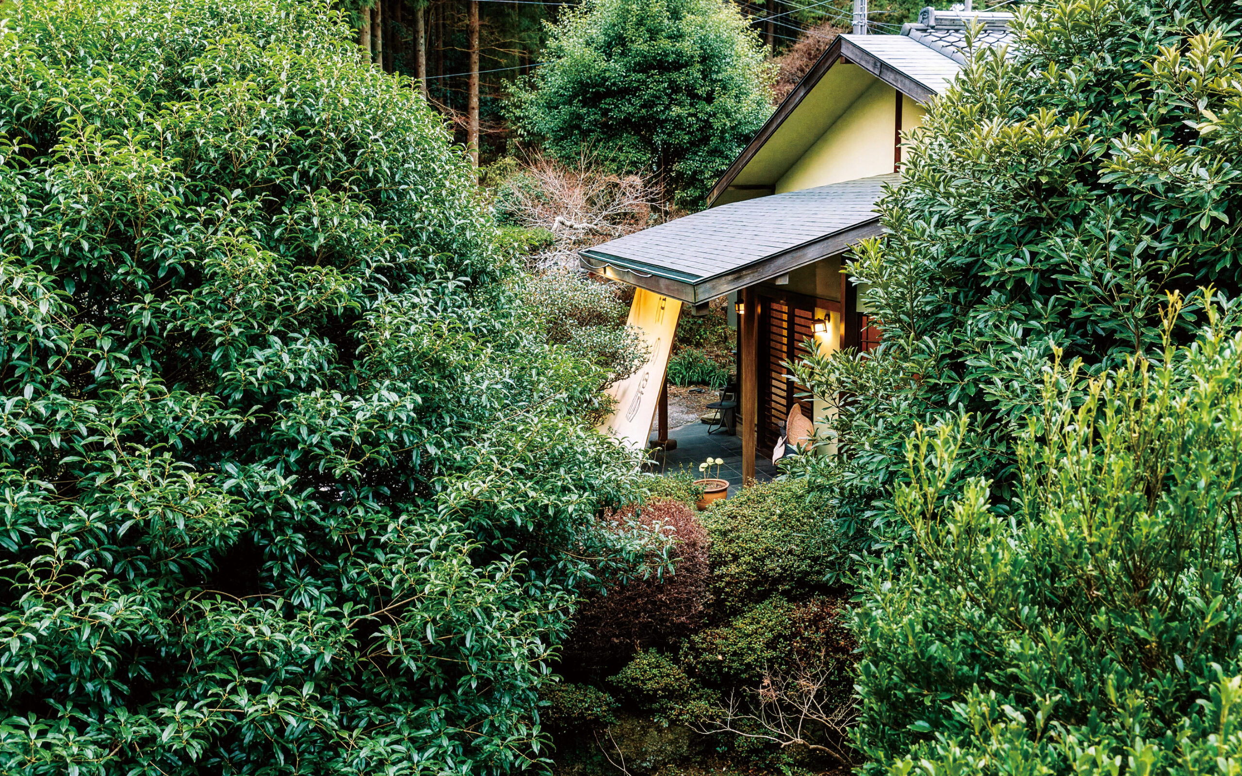 都心からそう遠くない場所にも関わらず、秘境感のある自然に囲まれた環境。四季の移ろいを間近に感じ、鳥のさえずりと小川のせせらぎに耳を傾け、静かな時間を過ごすことができる貴重なお宿です。建物の外観は、手入れがされた日本庭園が風情を醸す、武家屋敷風の日本家屋。庭の中央には大きな金木犀が鎮座し、花の咲く時期になると、館内いっぱいに金木犀の香りがたちこめます。