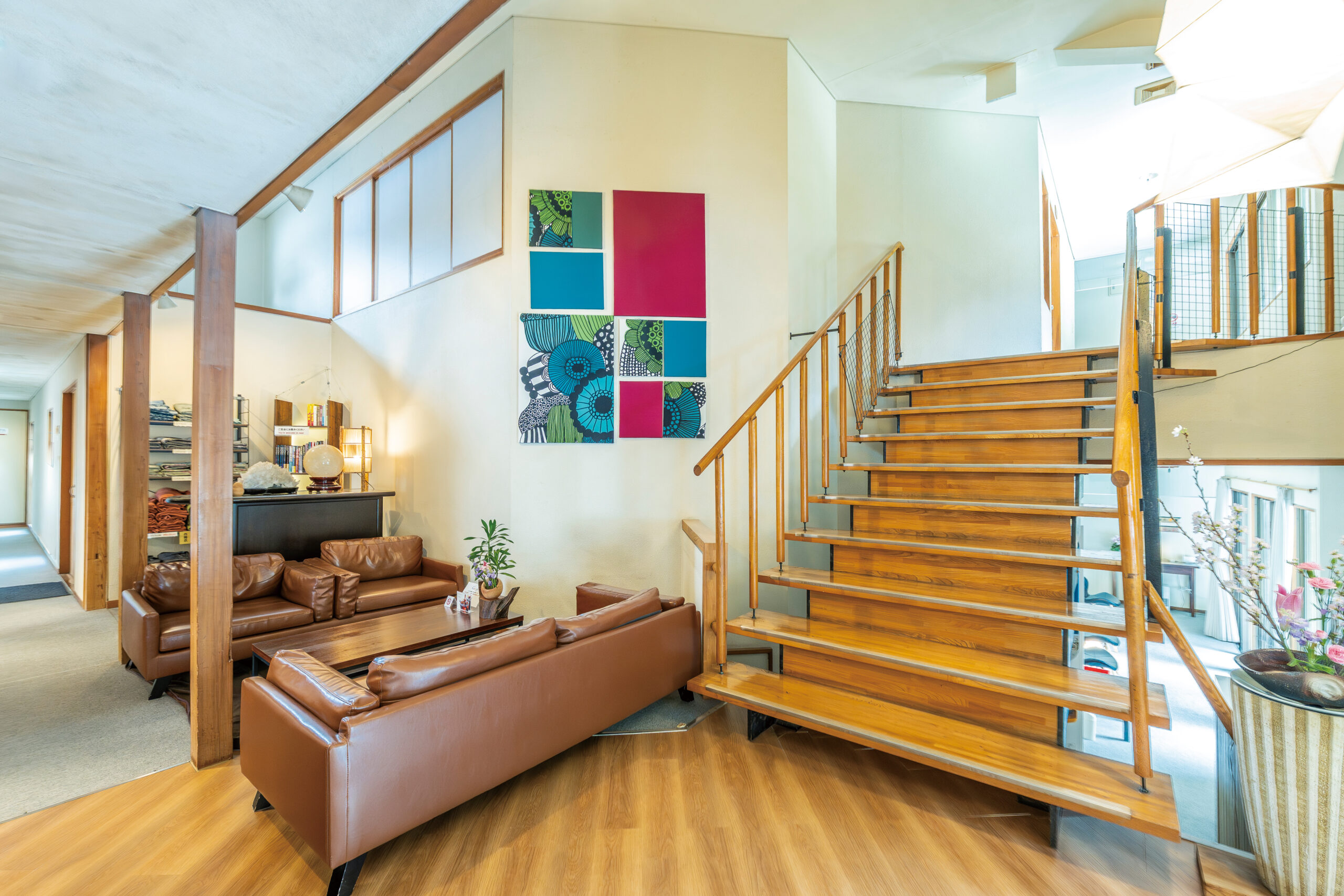 玄関では、創業以来ずっと住んでる信楽焼の狸たちがお出迎え。館内に入ると、ロビーにはジャズが流れ、壁に飾られたマリメッコのファブリックパネルが迎えてくれます。レトロモダンな雰囲気が心地良いですね。