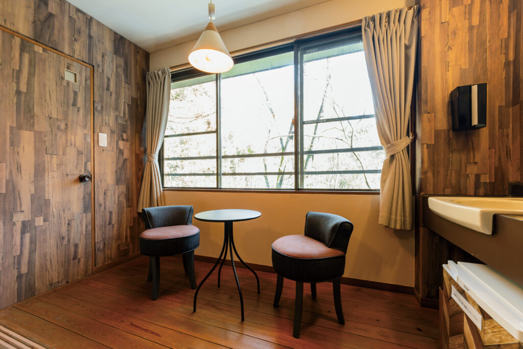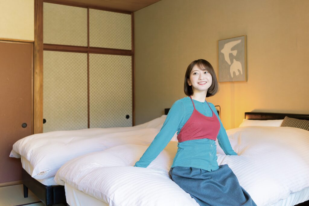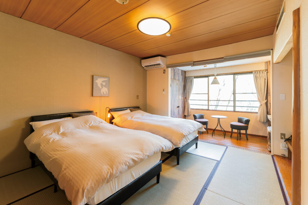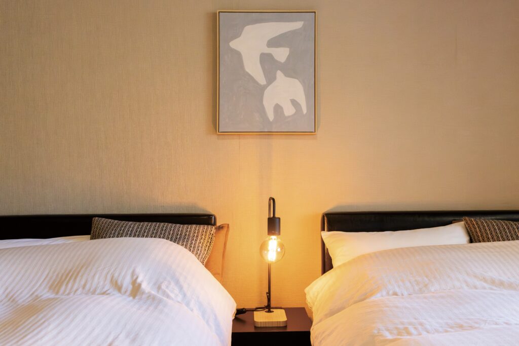 和モダンなベッドルーム「葵」「錦」の2室のみで、前者は2025年10月にリニューアルしたばかり。和と洋が調和した、くつろぎの空間が特徴。なんと、こちらのお部屋は女将やスタッフさんのD.I.Yで完成させたというから驚きです。