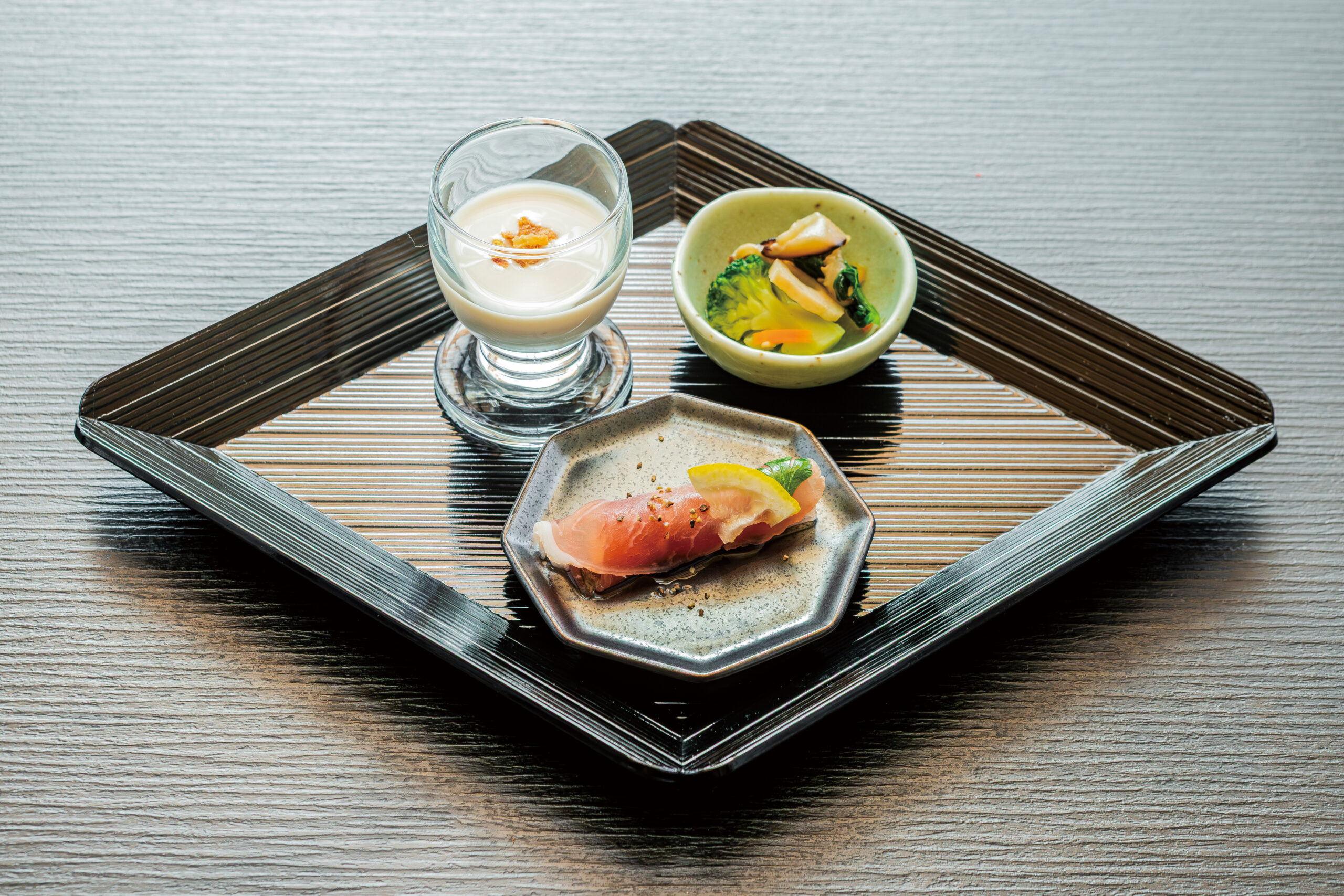 ・先附…牛蒡のポタージュ、ドライいちじくの生ハム巻き、冬野菜の和え物