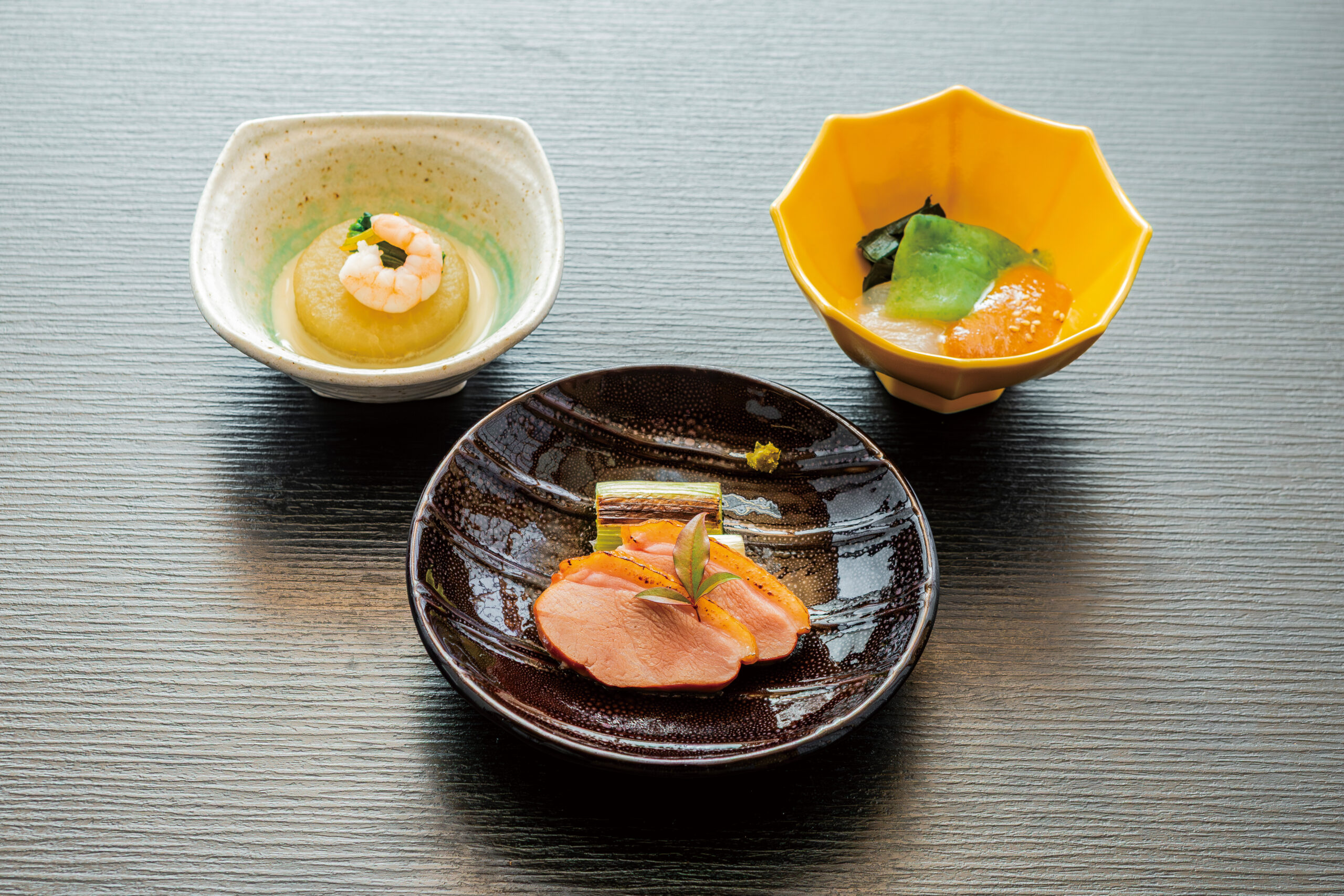 ・小鉢…群馬県下仁田産のどごし刺身こんにゃく、炙り鴨ロースと焼き葱〜柚子胡椒添え〜、ふろふき大根の白味噌仕立て
