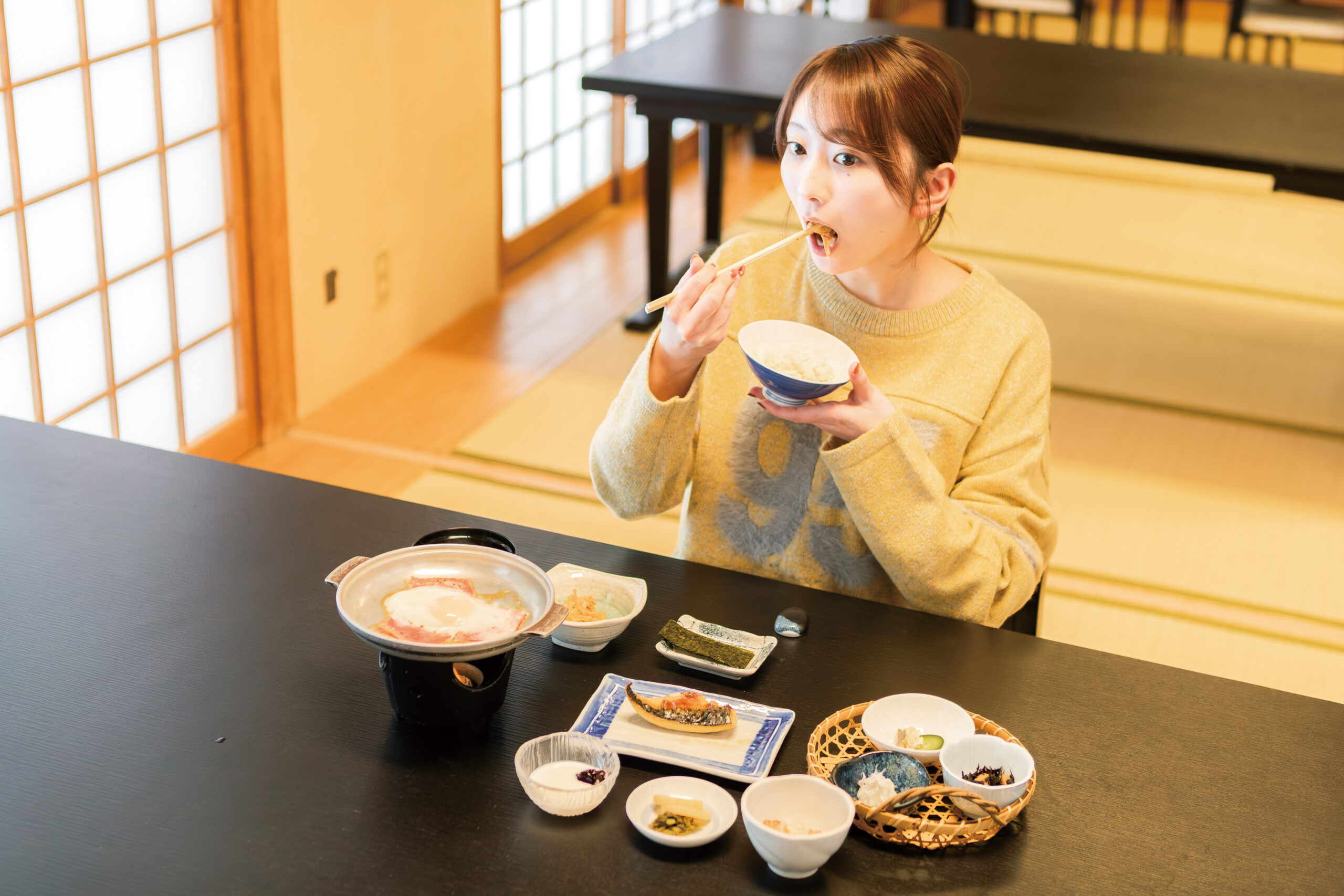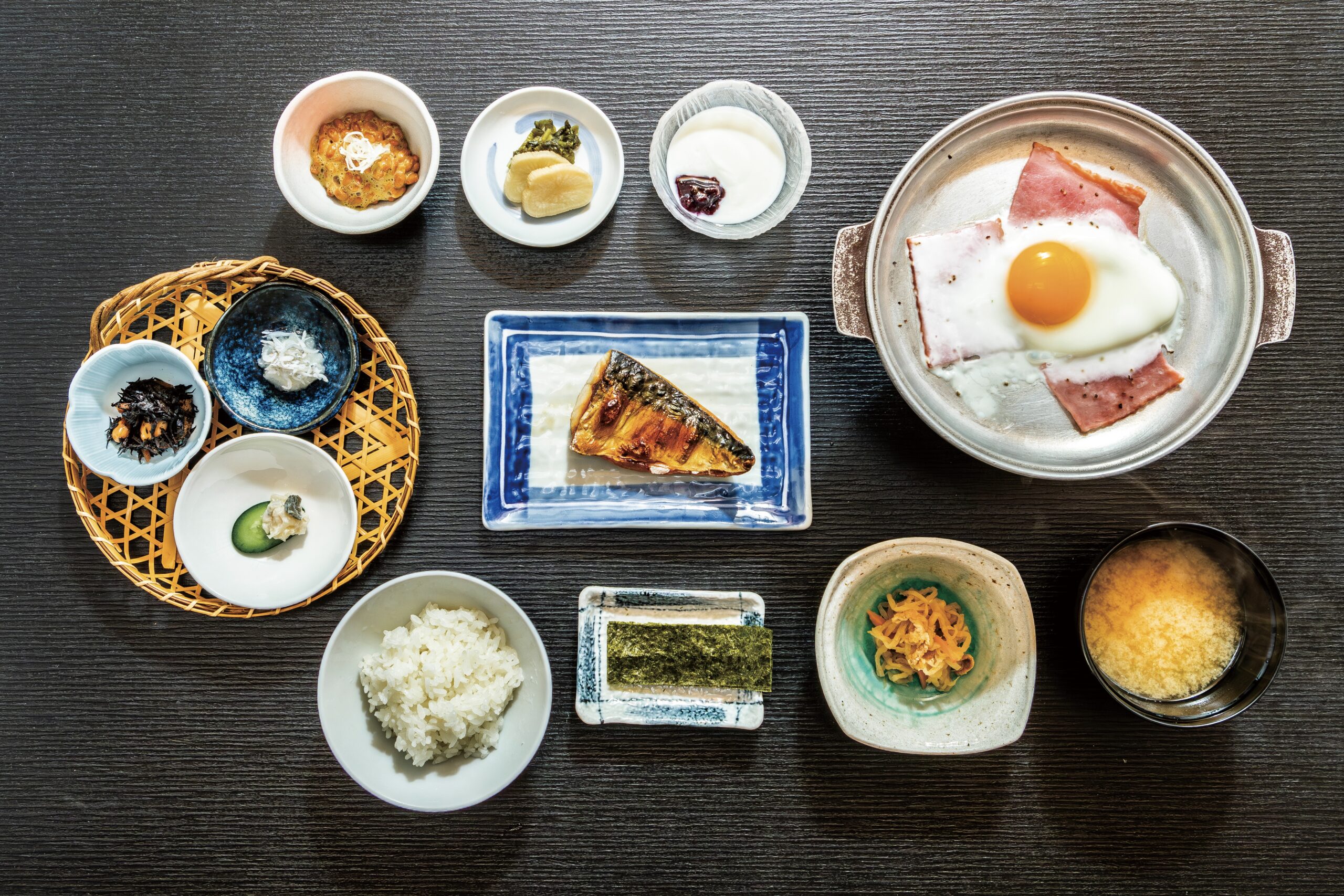 朝食は、ふわふわで焼きたてを味わえる塩鯖、季節の野菜を使った小鉢など、主に新鮮な地元食材を使った和食中心の身体に優しい家庭料理風の和膳を味わえます。鉄板のベーコンと卵は、お好みの焼き具合で食べることができます。