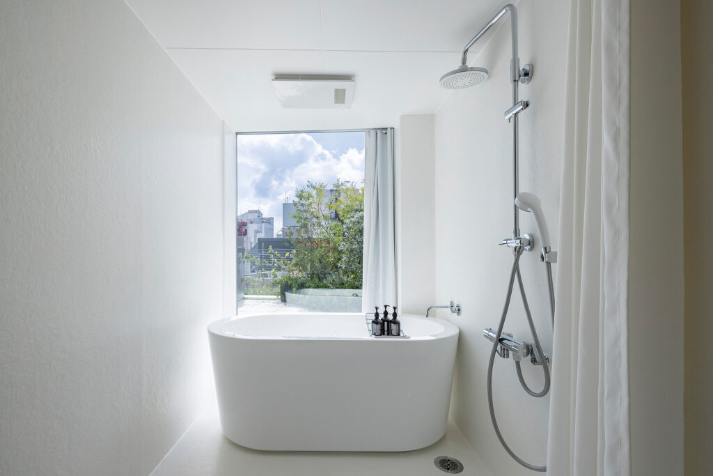 どの部屋も、間取りはコンパクトながら、内部と外部がゆるやかにつながる雰囲気を大切にしています。キューブ感からは想像し難い室内を走る斬新な斜めの壁は、不思議な奥行き感をもたらし、アートを飾る展示壁にもなっています。デザイン性の高いバスタブがあったり、シンプルで無駄のないキッチンも付いています。